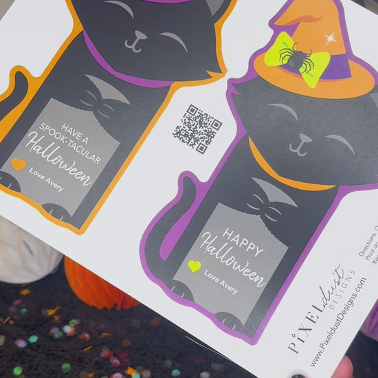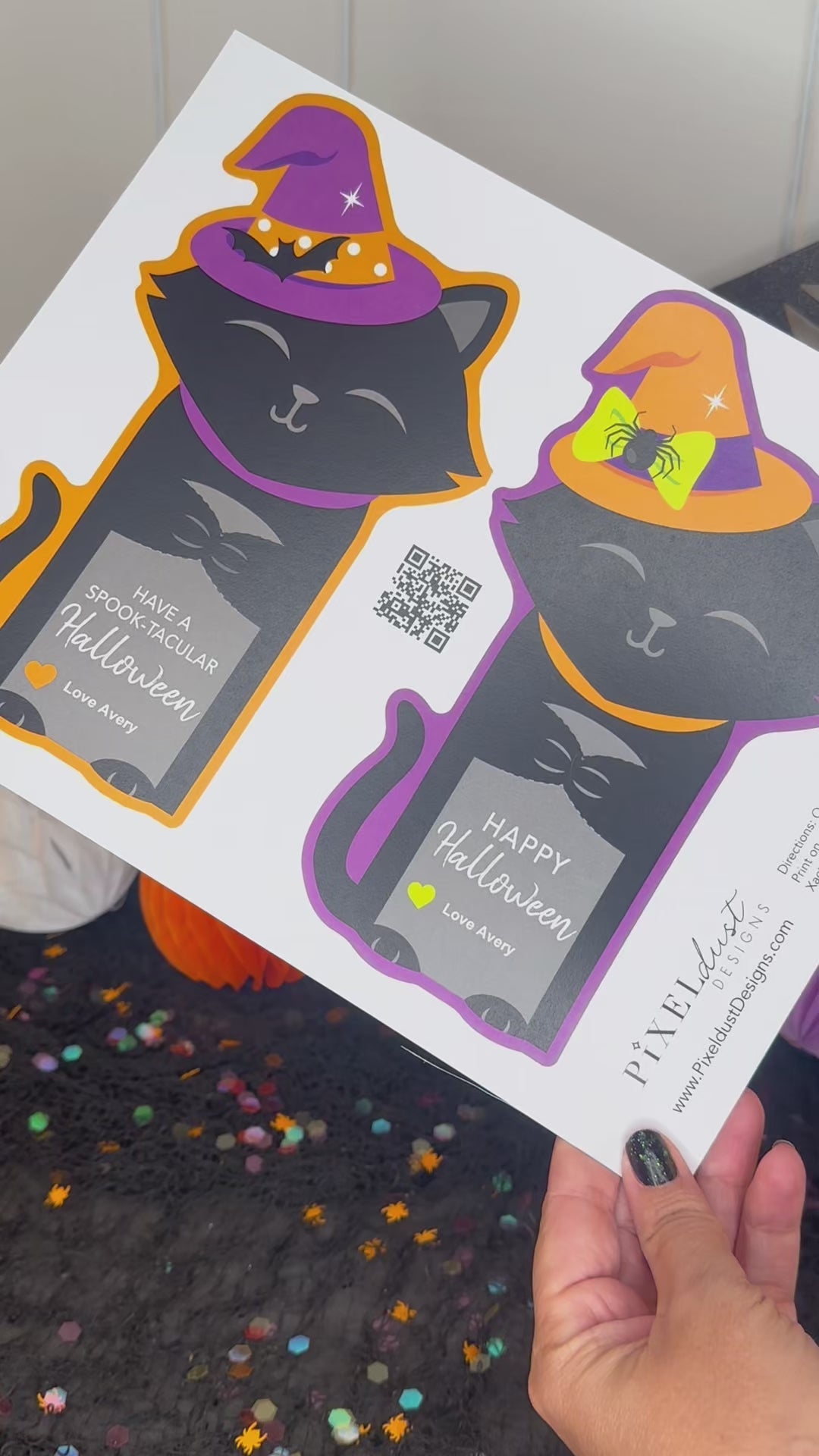 Cards print 2 per page in 2 different wording options: The cards on one page may be used for any treat you like and say "Happy Halloween" or "Have a SPOOK-TACULAR Halloween".